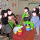 幼稚部ホールに豆をまき、その豆を拾っているところに、大きな音を立てて赤鬼がベランダから入ってきました。「おにはそと、ふくはうち」と大きな声で豆をまくと、鬼が逃げていきました。「やった~」と喜んでいたら、今度は赤鬼と緑鬼がやってきました。「忘れ物をしているのはお前か!」「やだやだ言っているのは誰だ!」などと詰め寄られ、「約束します」と指切りをしました。鬼に連れて行かれそうな友達や大人もいましたが、子供たちは勇気を出して助けに行きました。勇敢な姿がとても立派でした。