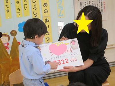 9月の誕生会をみんなでお祝いしました。誕生者は年少の子供でした。お母さんと一緒に生い立ちの発表をしました。