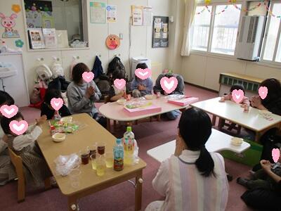 1年間の思い出ビデオを視聴したり、保護者の皆さんから子どもの成長や保護者自身の気持ちなどについて話していただいたりしました。その後、プレゼントのおやつをみんなで食べたり、保護者同士交流したりして、和やかな時間を過ごしました。