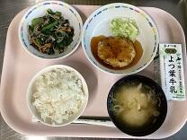 ごはん・玉ねぎのみそ汁・照り焼きハンバーグ・ほうれんそうの納豆和え