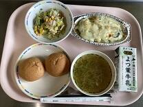 胚がロール・野菜スープ・マカロニグラタン・わかめサラダ