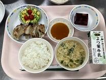 ごはん・にらたま汁・手作り餃子・ぶどうゼリー