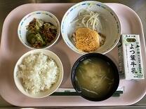 ごはん・卵のみそ汁・揚げ豆腐のあんかけ・ほうれん草の納豆和え