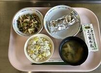 さつまいもごはん・玉葱のみそ汁・ホイル焼き・塩昆布和え